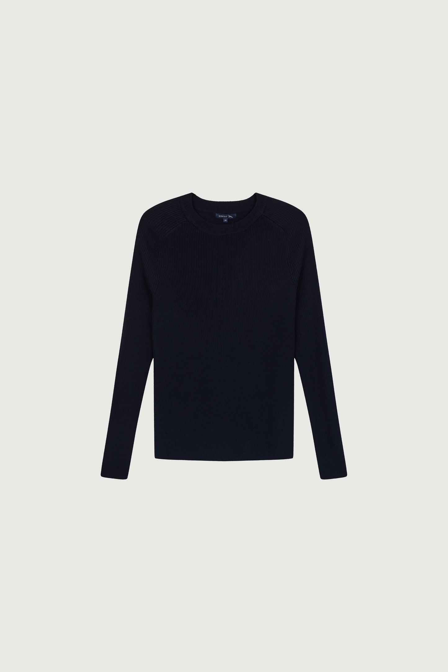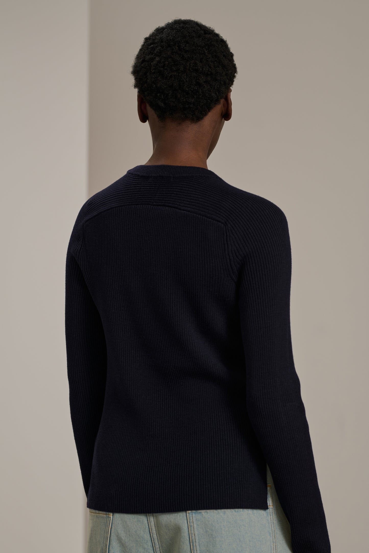 VERONA is a merino wool jumper with long sleeves, designed to be fitted and featuring a ribbed knit effect. It stands out with its side slits, adding a modern twist to its classic cut. Adorned with our tonal signature, it's a timeless piece that combines elegance and comfort.