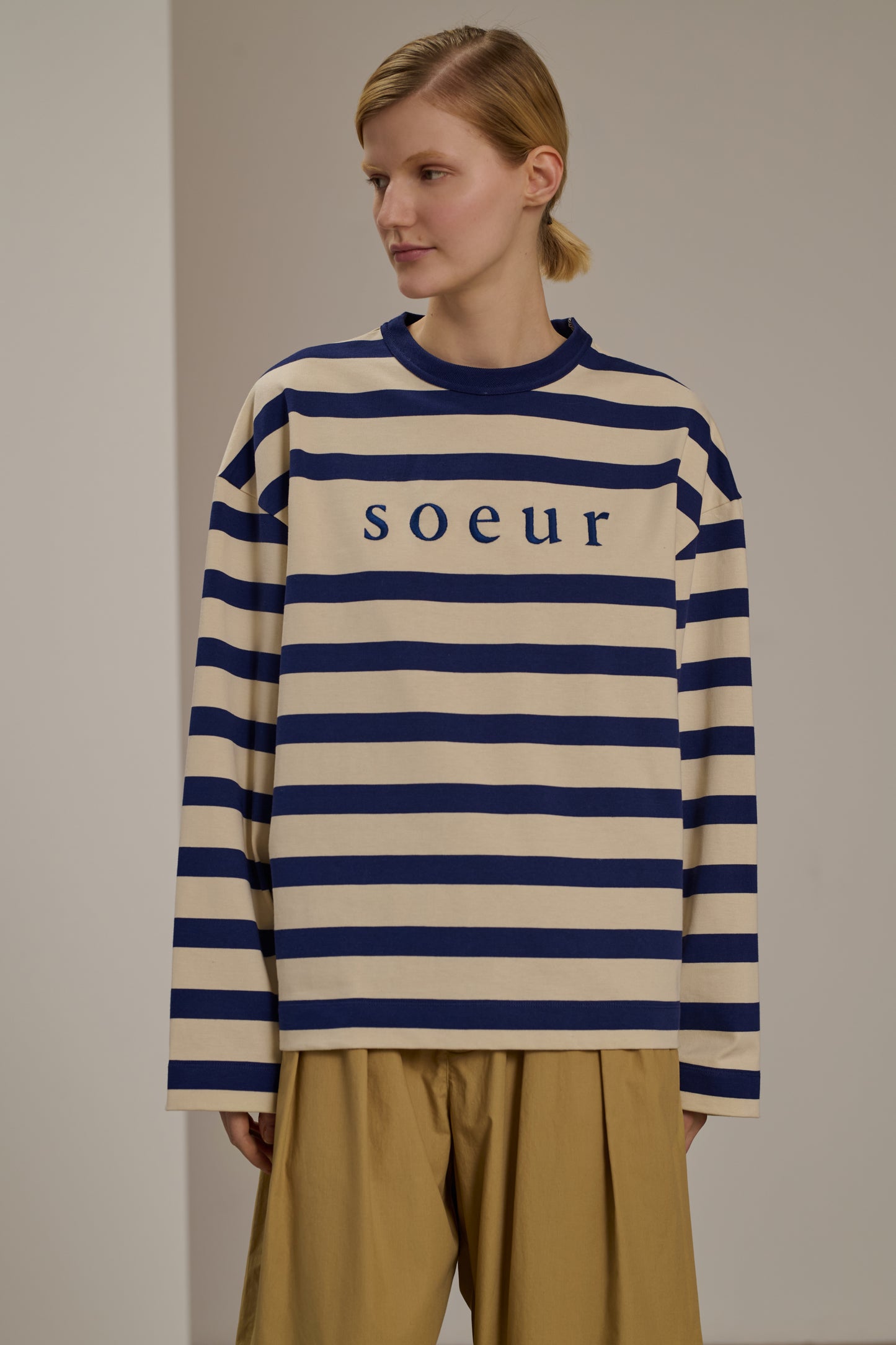 ARCHIE is our new sailor-stripe shirt. This version, sporting wide off-white and blue stripes, is made from organic cotton jersey. Its decidedly oversized cut can be worn as a relaxed T-shirt against the skin, or layered like a thin sweatshirt. The 'Soeur' logo is embroidered on the front.