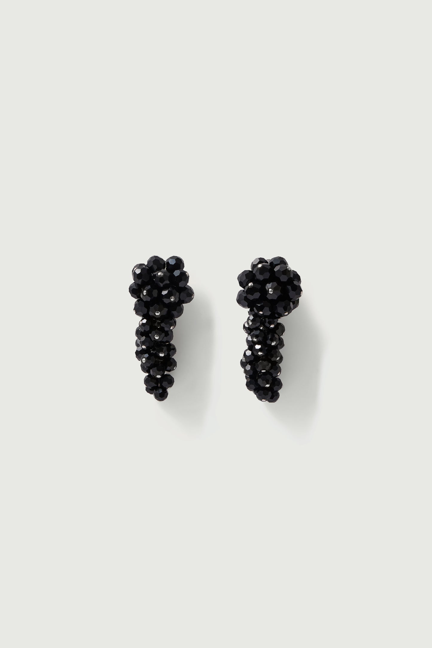 DOROTHY est une paire de boucles d'oreilles à fermeture clips. Rappelant une idée de grappe elle est faite de perles de verre facettées noires.