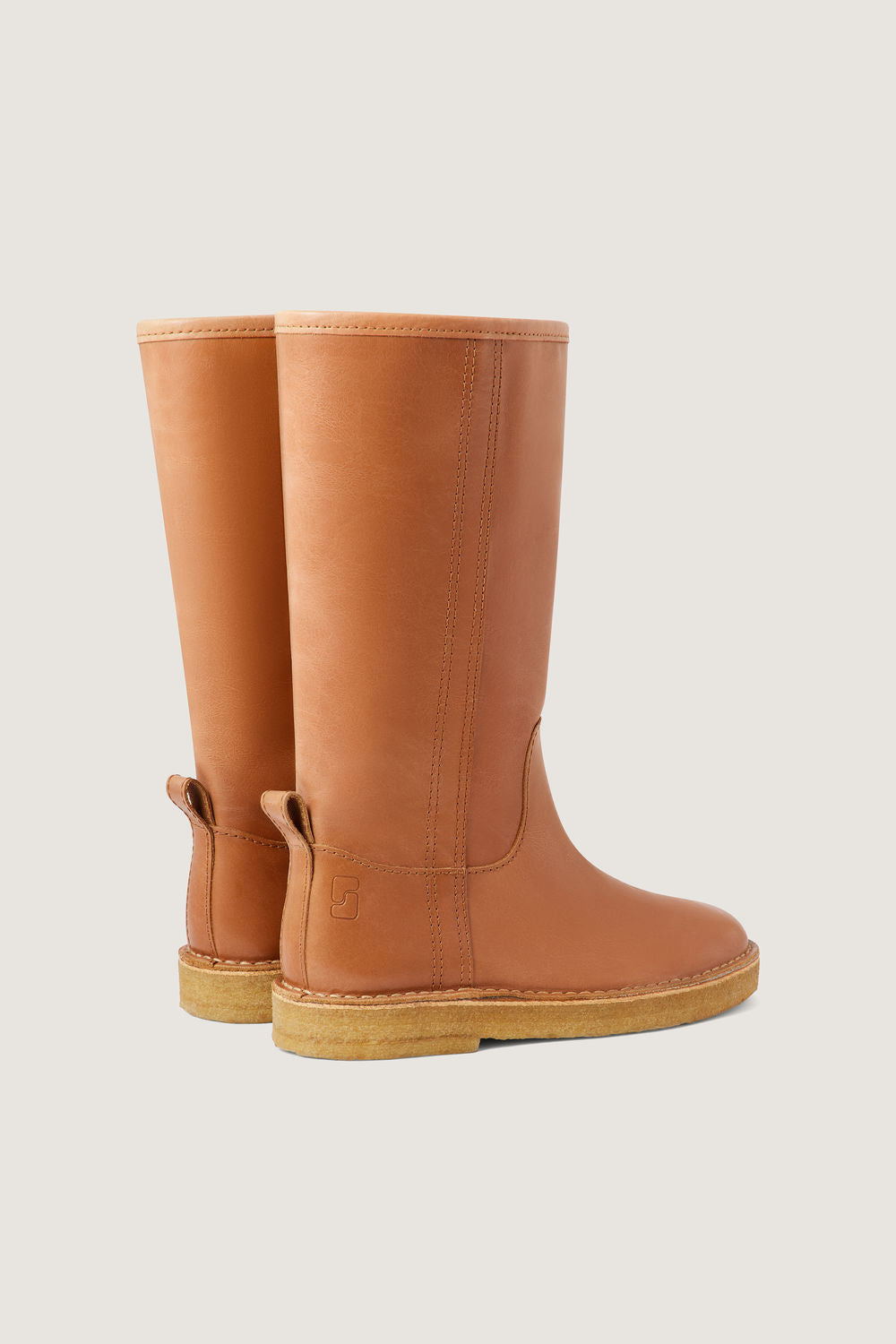 Bottes en cuir cognac - Bottes droites larges à enfiler- Semelle de crêpe épaisse- Hauteur de tige 30cm- Hauteur de talon 3cm- Cuir LWG