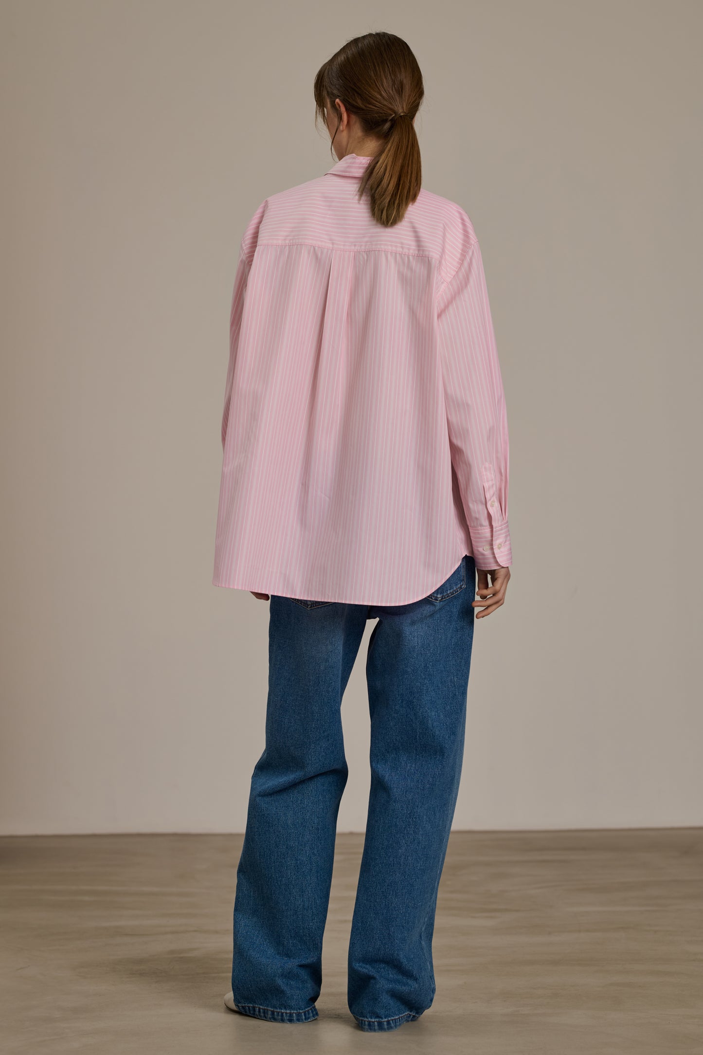 CARLOTTA est une chemise en popeline rayée qui joue sur une coupe oversize inspirée du vestiaire masculin, pour un style décontracté et élégant.