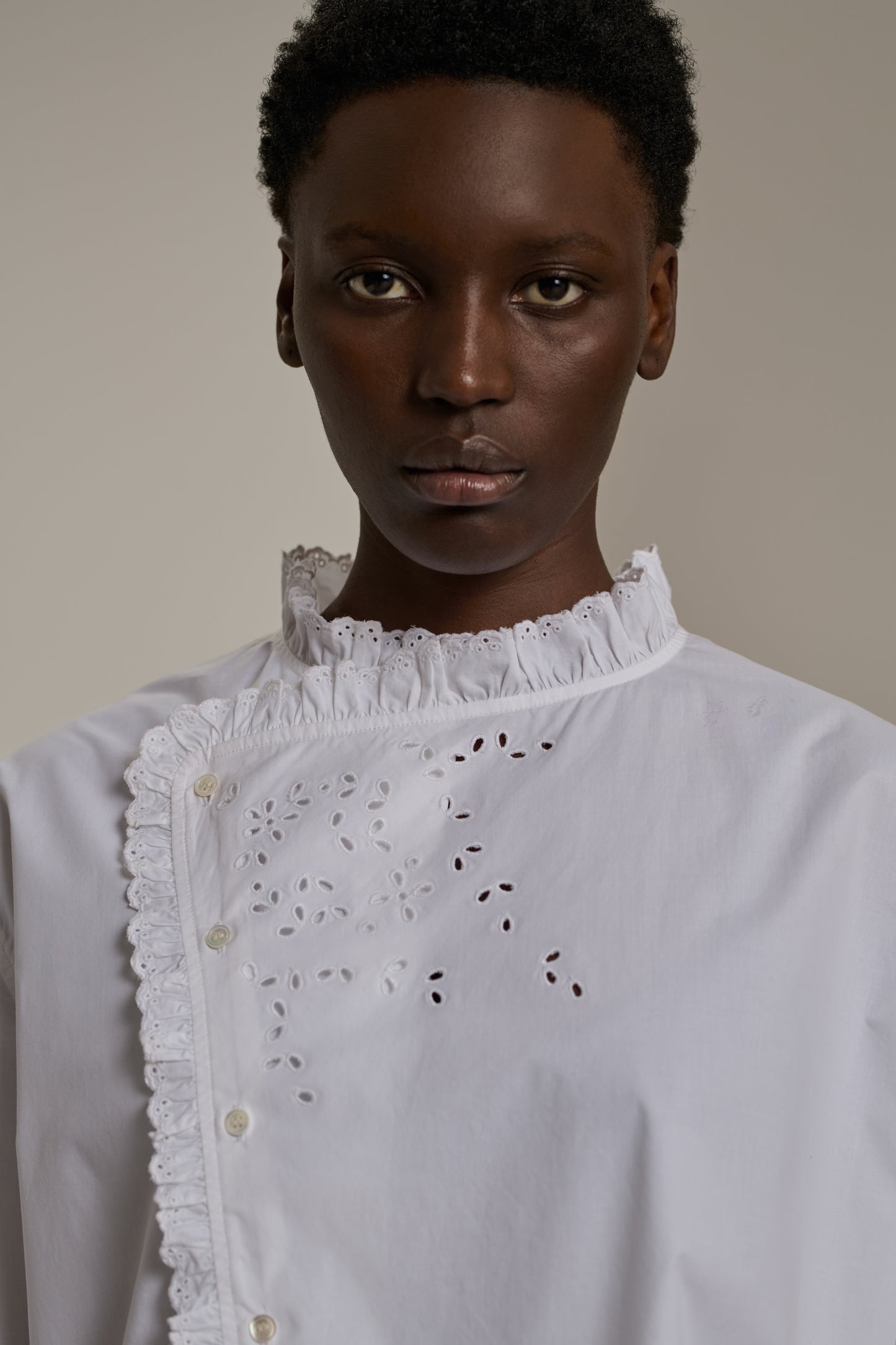 CLAUDIA est une chemise en popeline de coton à coupe droite. L'ouverture boutonnée au col, associée à une patte de boutonnage fantaisie, ajoute une touche distinctive et raffinée, parfaite pour sublimer vos tenues quotidiennes.