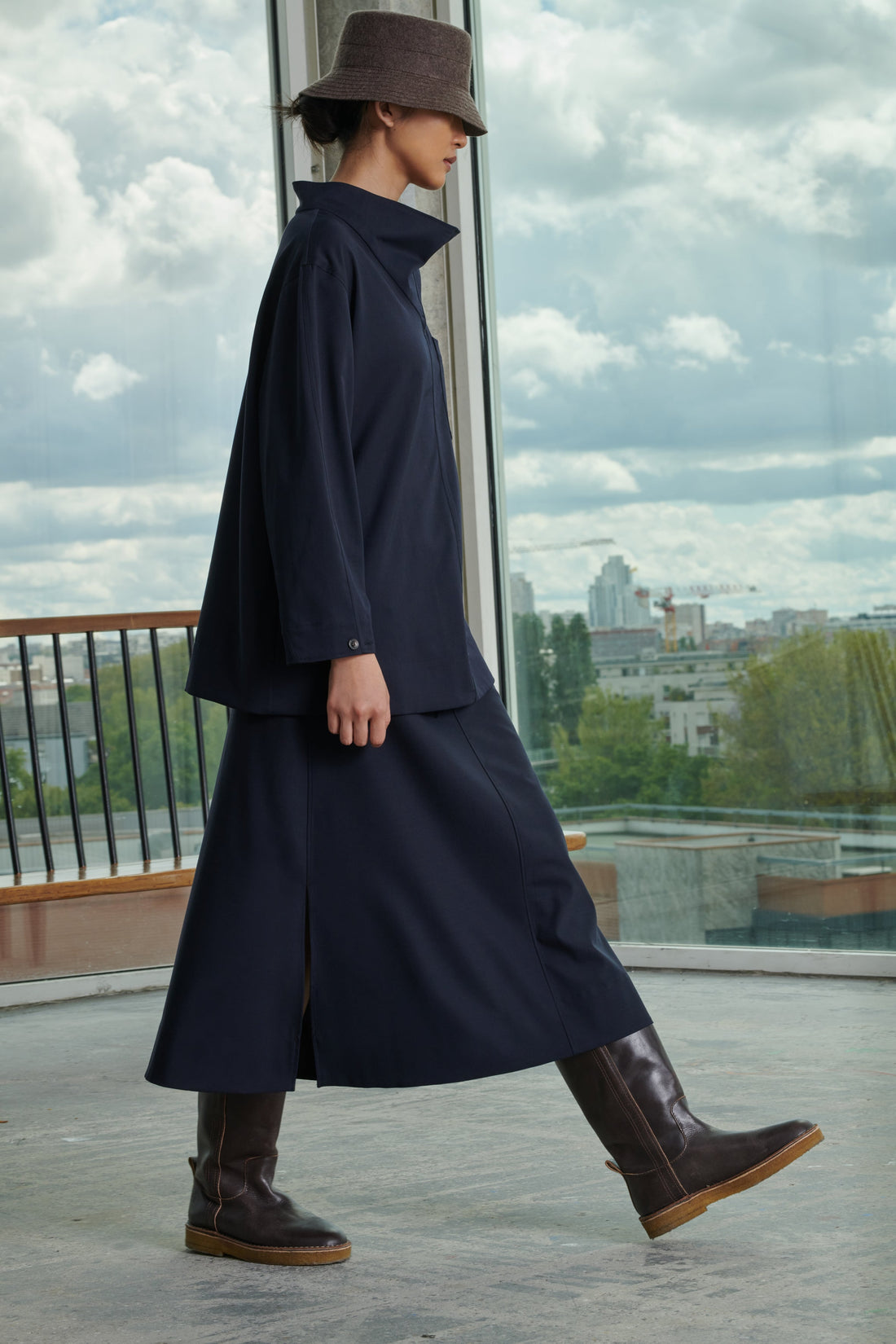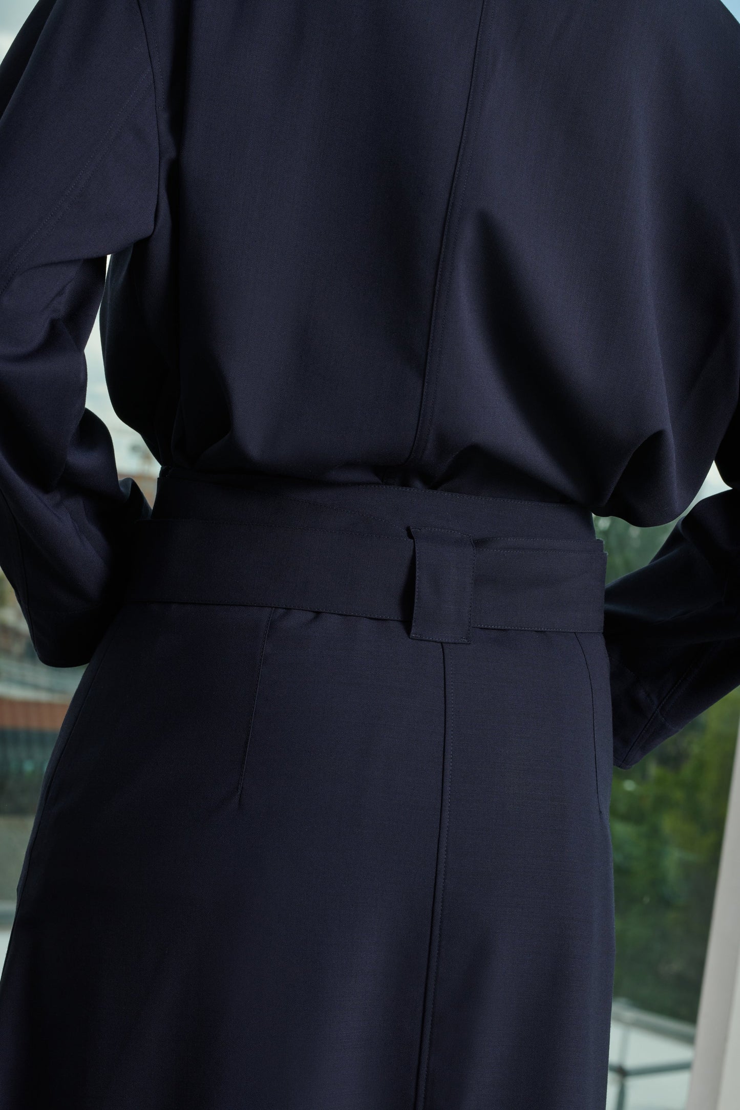 VERSAILLES est une jupe en lainage fin et souple. Une large ceinture permet de faire un double tour pour souligner la taille haute. Elle possède des fentes aux cotés qui ajoutent du mouvement. C'est un essentiel facile à associer et qui convient à toutes les morphologies.