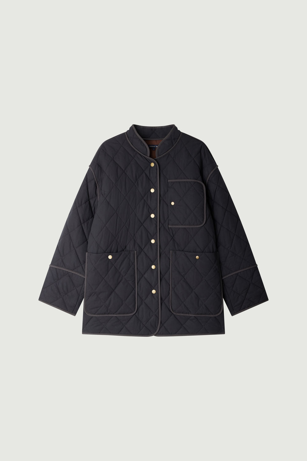 BELFAST est un manteau court en coton émerisé, réalisé dans un matelassage fin en losanges. Il se ferme avec des boutons-pression, et dispose de deux poches plaquées, une poche poitrine et une poche intérieure pour une fonctionnalité pratique. Sa coupe est soulignée par un biais gris anthracite.