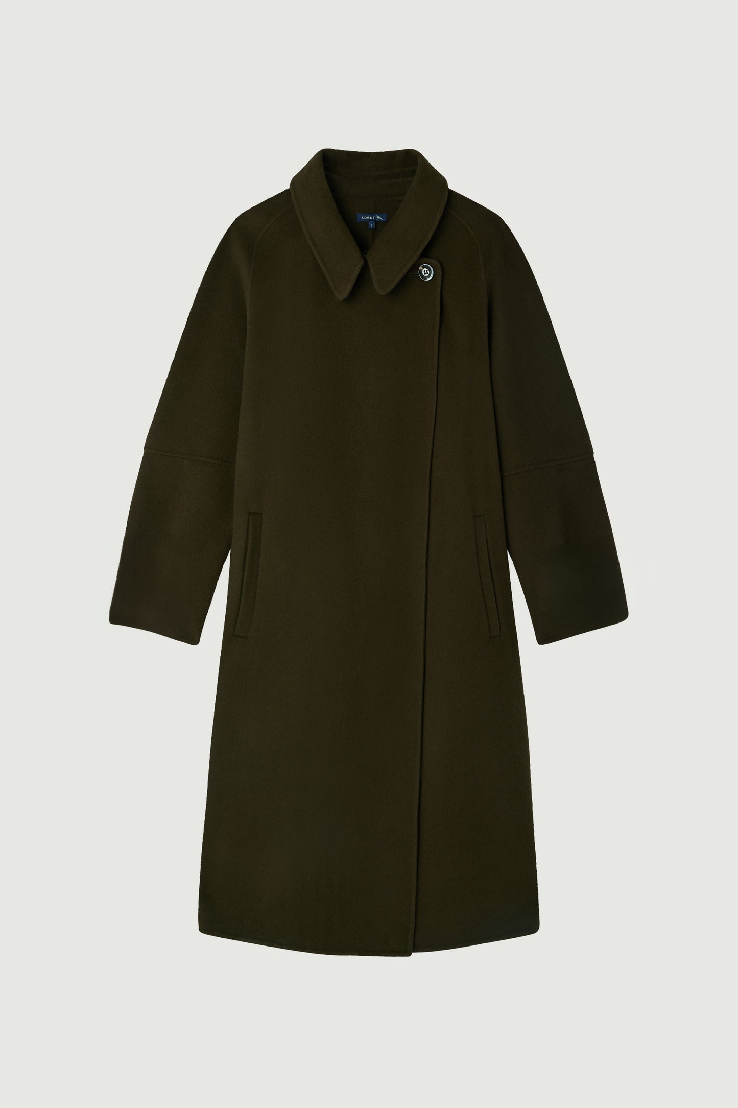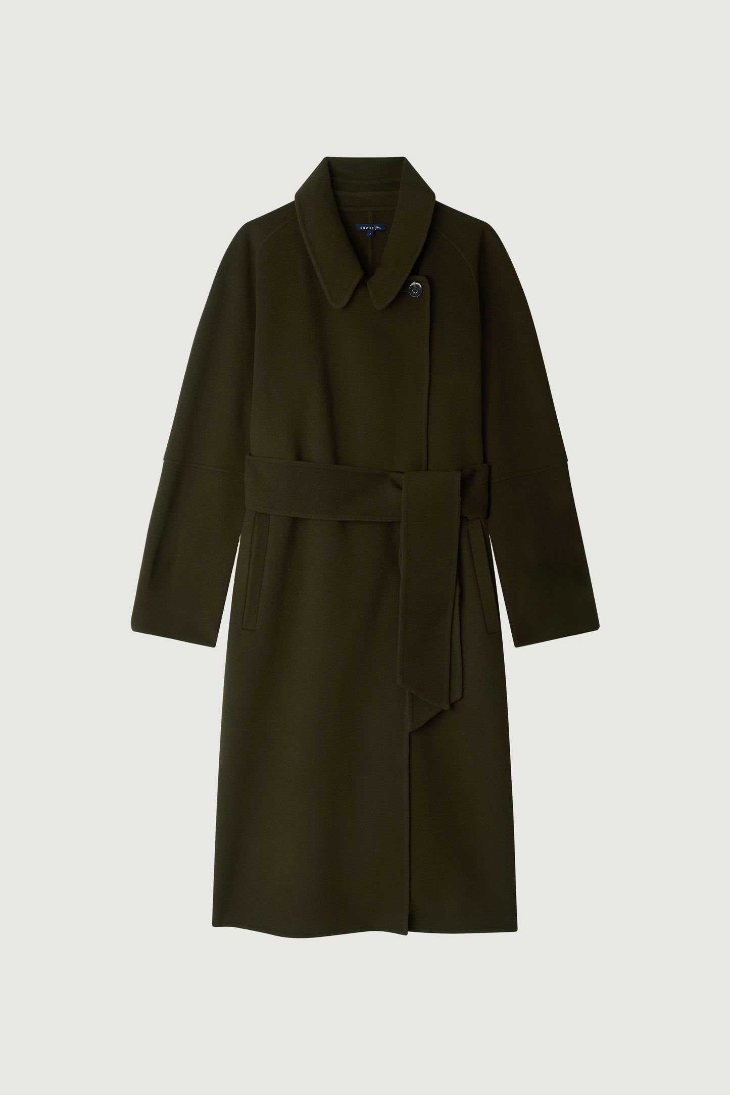 CHAMBERY est un manteau long au volume qui suit la silhouette, confectionné en laine double face dans une teinte de kaki foncé. Il dispose d'un col amovible avec boutons et se ferme avec une ceinture amovible pour un ajustement parfait. Dans l'esprit minimal, les coutures cachées viennent souligner la coupe sophistiquée et intemporelle.