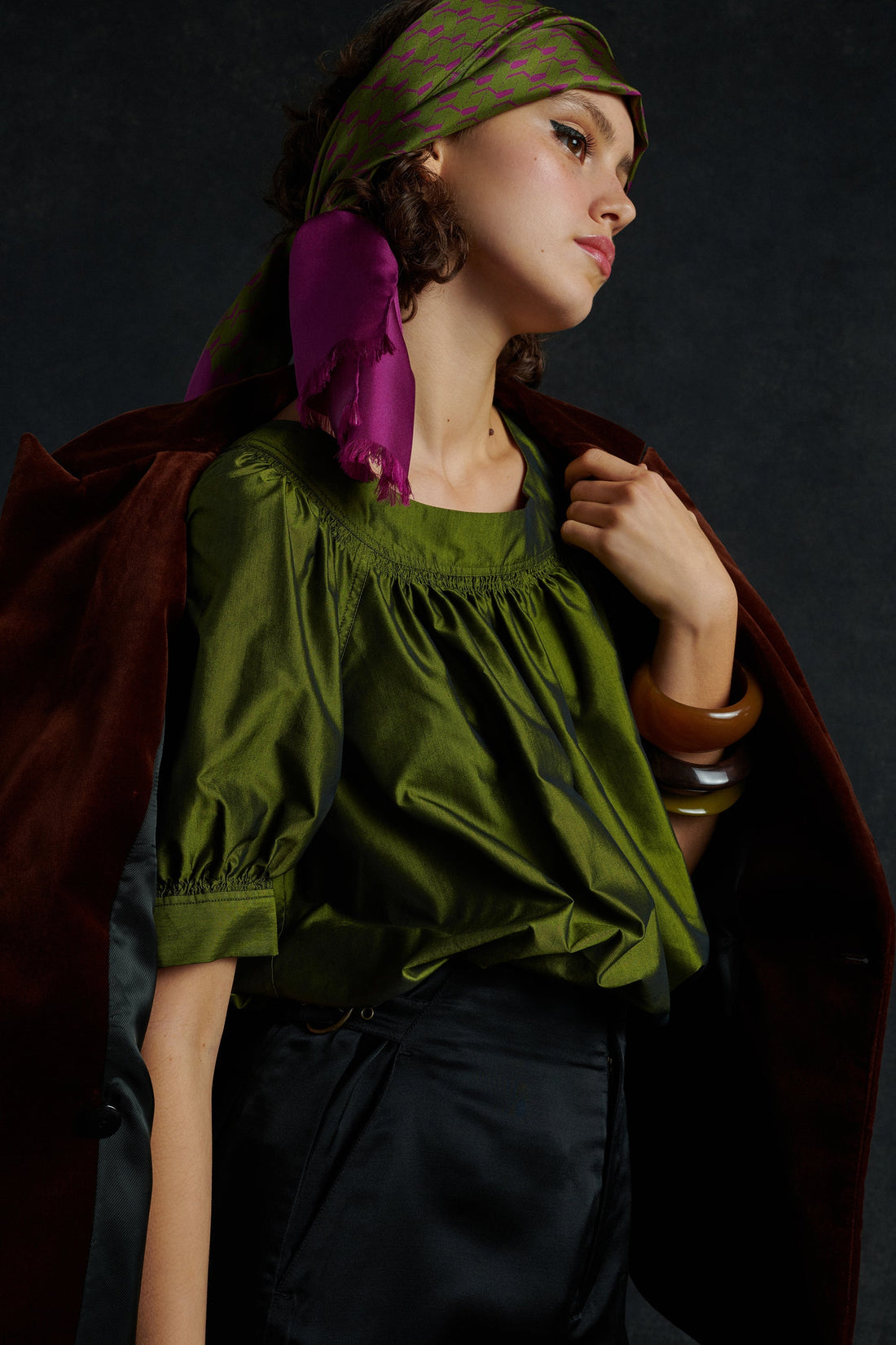 SPIRIT est un pantalon à la coupe ample et généreusement arrondie qui s’ajuste à la taille grâce à des pattes de resserrage. Il dispose d'un revers en bas de jambe et est réalisé dans un satin brillant et épais. Pour sublimer votre look, associez le avec la blouse SCINTILLANTE.