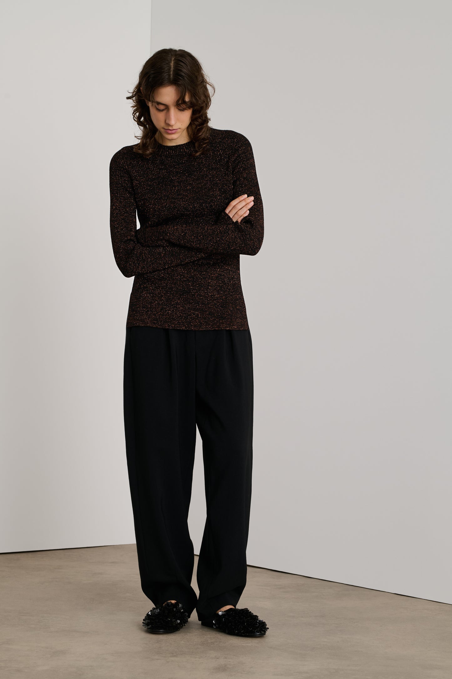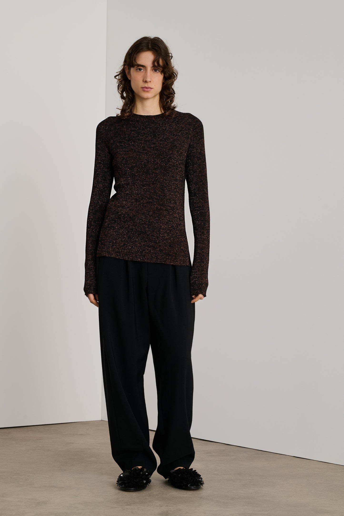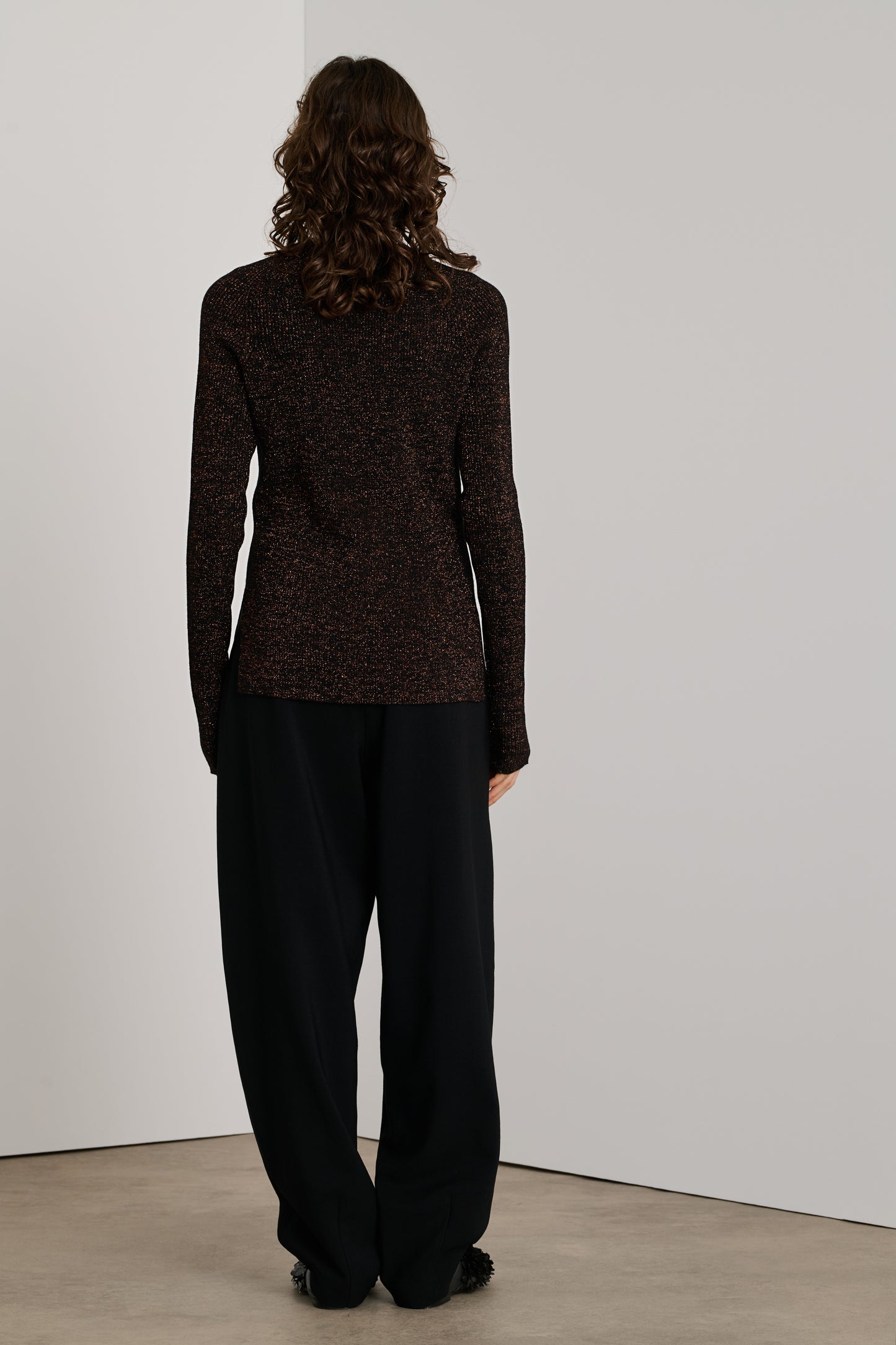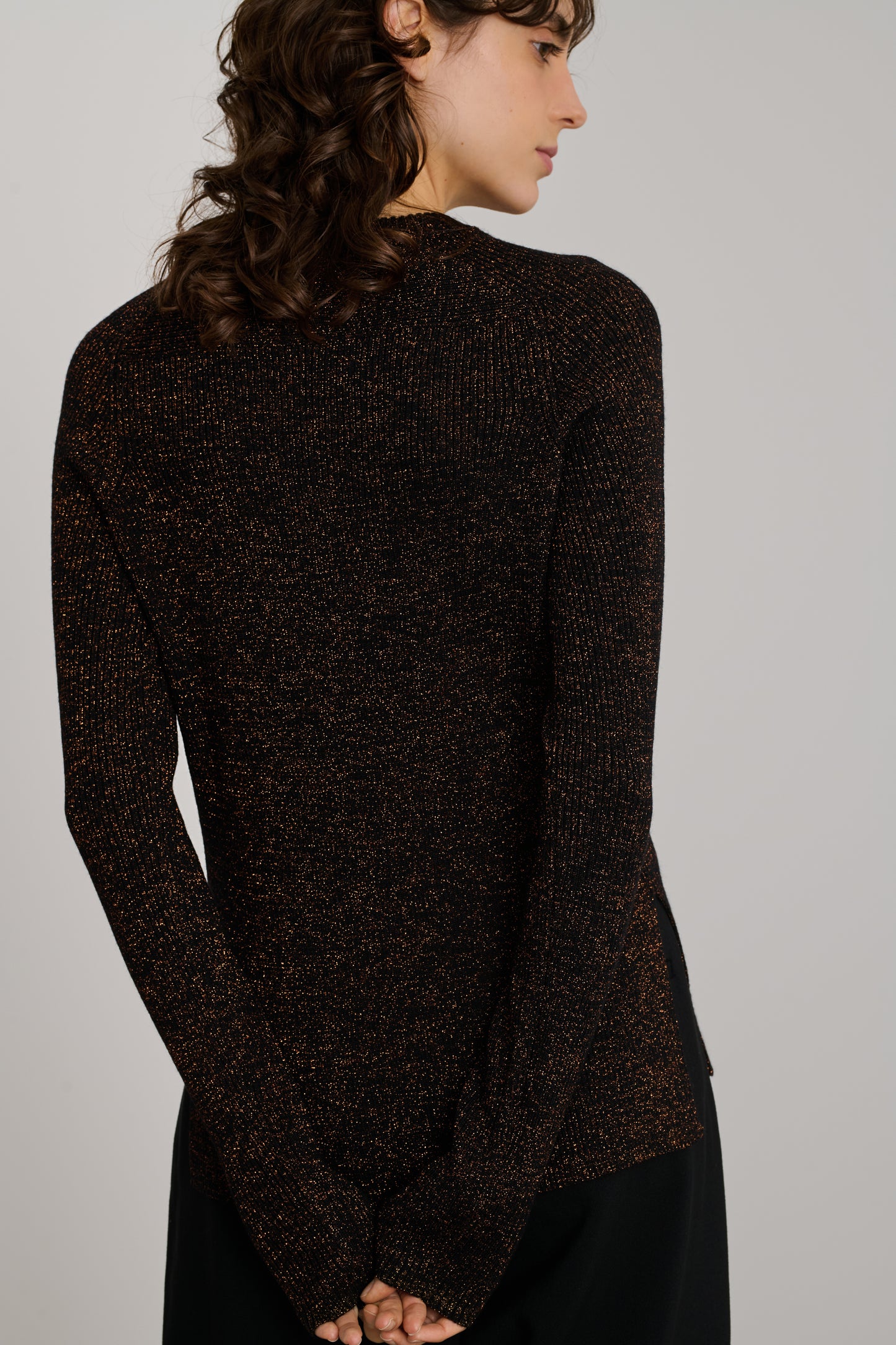 VERONA est un pull à côtes tricoté dans un fil de laine mérinos, mélangé à du lurex pour un effet irisé. Sa coupe est droite, près du corps, son encolure ronde.